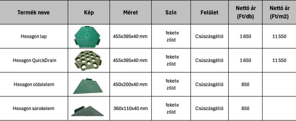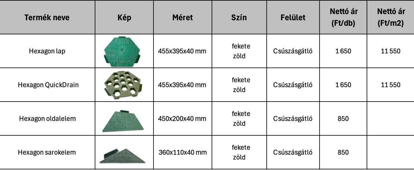 A Hexagon kültéri padozat egy többször telepíthető, ideiglenes térburkoló rendszer, amely kiváló megoldást nyújt átmeneti parkolók, járdák, sík területek vagy rendezvényhelyszínek gyors és hatékony burkolására. Az elemek interlock kialakítása révén egyszerűen egymásba illeszthetők, így stabil, egybefüggő felület hozható létre.