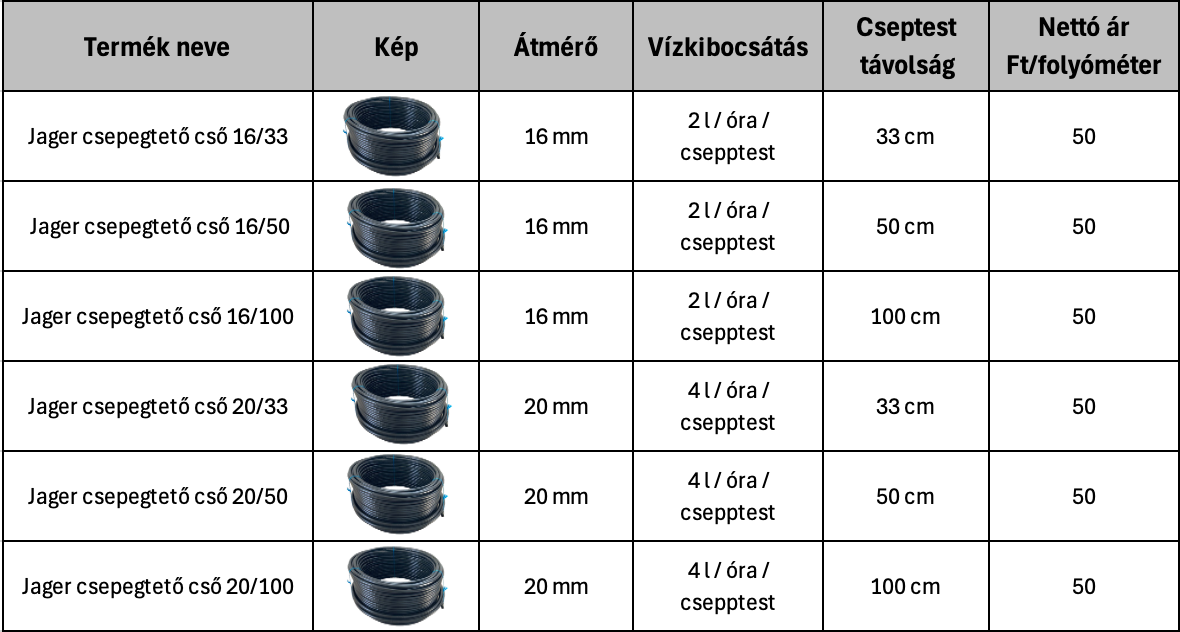 A Jager csepegtetőcsövek prémium minőségű polietilénből készülnek, UV-álló adalékanyaggal kiegészítve, ami biztosítja az időjárási körülményekkel szembeni hosszú távú ellenállást. Termékeink különféle típusokban, 16 mm-es és 20 mm-es átmérővel érhetők el, így könnyedén igazíthatók a különböző ültetvények specifikus igényeihez.
